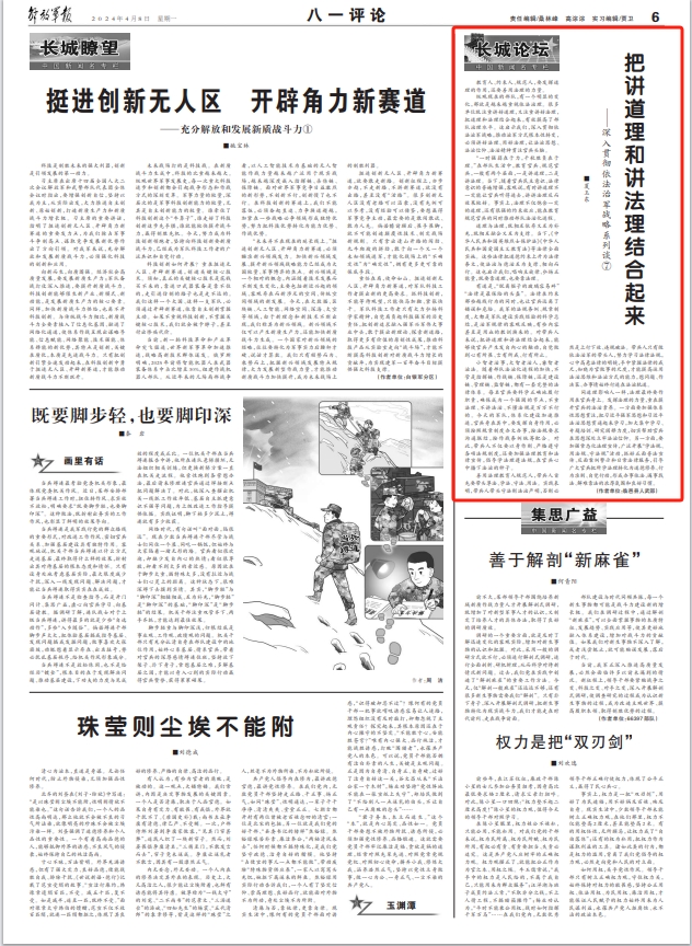 纵观现在的部队,有一个明显的变化,那就是越来越重视依法治理。很多单位既注重讲好道理,又注重讲好法理,把道理和法理结合起来,有效提高了部队治理水平。这启示我们,深入贯彻依法治军战略,推动治军方式根本性转变,必须讲好法理、用好法理,让法治思想、法治信仰、法治精神贯注官兵头脑。