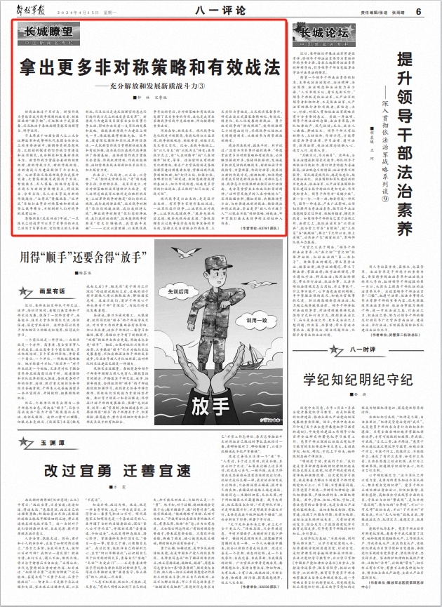 兵法云:“凡战者,以正合,以奇胜。”“正”指的是常规手段,“奇”则为超常手段、非对称手段。我军历史上,对非对称策略的运用堪称炉火纯青。有人这样总结我军从胜利走向胜利的历史:土地革命战争时期是“你打你的正规战、我打我的游击战”,抗日战争时期是“你打你的速决战、我打我的持久战”,解放战争时期是“你打你的阵地战、我打我的运动战”,抗美援朝战争时期是“你大打钢铁战、我零敲牛皮糖”……一次次以弱胜强、以劣胜优战争奇迹的背后,非对称策略和有效战法发挥了至关重要的作用,这也是我军在长期战争实践中克敌制胜、所向披靡的重要法宝。