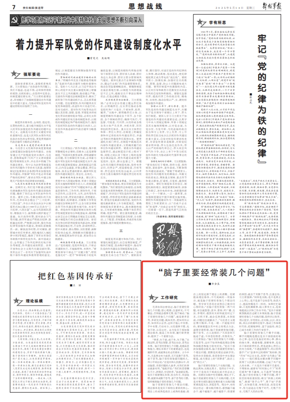 “事者,生于虑,成于务,失于傲。”实践证明,思考出智慧、思考出办法、思考出本事。脑子里经常装几个问题,是提高思维能力、增长本领才干的重要途径,也是履职尽责、成就事业的必然要求。古今中外,凡是事业有大成者,无不是勤于思考、善于思考,脑子里经常装着问题的人。邓小平同志说:“在党内和人民群众中,肯动脑筋、肯想问题的人愈多,对我们的事业就愈有利。”他批评说:“我们的思想懒汉不少,讲现话、空话的多。”奋进新征程,党员干部要增长本领、担当作为、争创佳绩,就要养成勤于思考、善于思考的习惯,坚持做到脑子里经常装几个问题。
