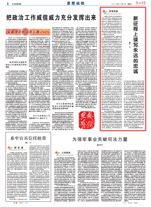 以实干笃行践忠诚。忠诚是政治标准,更是实践标准,最终要见诸行动、见诸实效。超算专家王戟因病截肢后仍坐在轮椅上向科技之巅冲锋,他说:“只要大脑还能思考,双手还能敲击键盘,任何困难都不能阻止我前进的步伐。”他将身体局限化为冲锋支点,把铮铮誓言焊进每个字节,用实际行动书写忠诚与担当。军队党员干部要不断砥砺对党忠诚的政治品格,就必须做到履职尽责、挺膺担当。带头研战备战,强化备战打仗的紧迫意识,带头研究军事、研究战争、研究打仗,练谋略、练指挥、练应变,自觉把对党忠诚体现到能打仗、打胜仗上。带头精武强能,积极投入军事训练、苦练胜战本领,努力成为带兵打仗的行家里手。带头冲锋陷阵,攻坚克难、勇往直前,在完成急难险重任务中淬炼血性胆气,在真刀真枪的比拼中践行忠诚誓言。