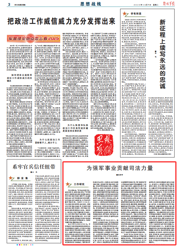 习主席指出:“军队越是现代化,越是信息化,越是要法治化。”军事司法作为国家司法体系的重要组成部分和军事体系的关键支撑环节,是连接国家法治与军事治理的桥梁和纽带,关乎依法治军战略落地,关乎新时代强军事业发展。党的十八大以来,习主席高度重视军队法治建设,持续深化军事司法体制改革,我国军事司法体制实现改革重塑,军事司法工作服务保障作用得到充分彰显。新征程上,我们要以习近平强军思想为指导,深入学习贯彻习近平法治思想,准确把握军事司法的职能定位,充分发挥其在中国特色军事法治体系中的重要作用,积极推动军事司法建设,为新时代强军事业贡献司法力量。