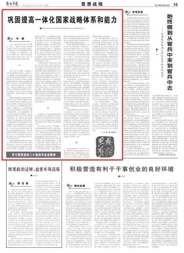 赢得国家战略优势的必然要求。当今世界,国家间的竞争已从单一领域博弈转向全方位体系对抗,战略优势的争夺越来越依赖于国家整体实力的高效聚合与释放。巩固提高一体化国家战略体系和能力,正是增强国家战略优势的关键。这一战略部署通过深度整合国防建设与经济社会发展的资源配置,推动技术、人才、产业、基础设施等关键要素的跨域融合,使分散的“资源拼图”转化为有机统一的“能力整钢”,实现国家战略能力最大化。随着巩固提高一体化国家战略体系和能力的不断深入推进,我们就能在应对战略竞争、维护国家核心利益时,既有坚实的经济基础作支撑,又有强大的国防力量作保障,从而在复杂的国际格局中牢牢掌握战略竞争主动权。