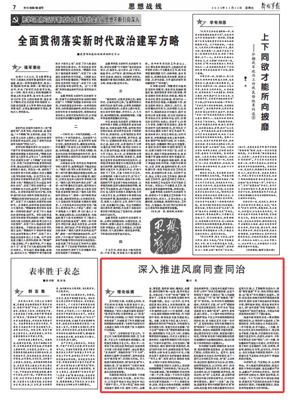 风清则气正,气正则心齐,心齐则事成。深入推进风腐同查同治,既是反腐败斗争的实践创新,也是全面从严治党、全面从严治军的必然要求。我们要始终保持战略定力,坚持查治贯通、标本兼治,下大气力斩断风腐勾连的链条,营造风清气正的政治生态和干事创业的良好氛围,为推进强国建设、民族复兴伟业提供有力作风保障。