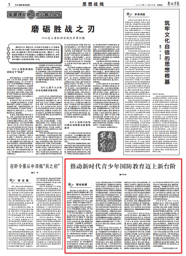 国无防不立,民无防不安。全民国防教育是建设巩固国防和强大人民军队的基础性工程,是党的宣传思想工作的重要组成部分。今年8月,中共中央宣传部等印发通知,组织开展2025年“全民国防教育月”活动,通知提出要“开展青少年国防教育活动”。党的二十届四中全会通过的《中共中央关于制定国民经济和社会发展第十五个五年规划的建议》指出,要“深化全民国防教育,巩固军政军民团结”。广大青少年是祖国的未来、民族的希望,也是党的未来和希望。进一步加强新时代青少年国防教育,是推进全民国防教育的重要内容,也是促进青少年身心健康发展、厚植家国情怀的有效途径。立足新阶段,阔步新征程,我们要下力气推动新时代青少年国防教育迈上新台阶,积极促进“关心国防、热爱国防、建设国防、保卫国防”成为广大青少年的思想共识与行动自觉,为筑牢国家安全人民防线、实现中华民族伟大复兴的中国梦,贡献持久力量。