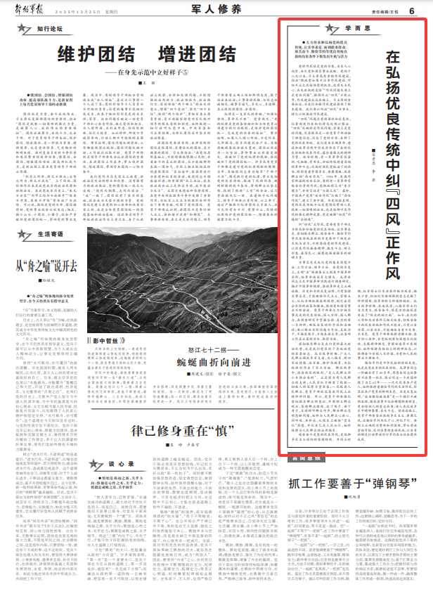纠“四风”正作风,需要党员干部大力传承和弘扬党的优良传统,让实事求是、密切联系群众、艰苦奋斗、勤俭节约等优良传统在新的历史条件下焕发出生机与活力,不断推进党的作风建设,以优良作风振奋精神、激发斗志、树立形象、赢得民心,凝聚起强国强军的磅礴力量。