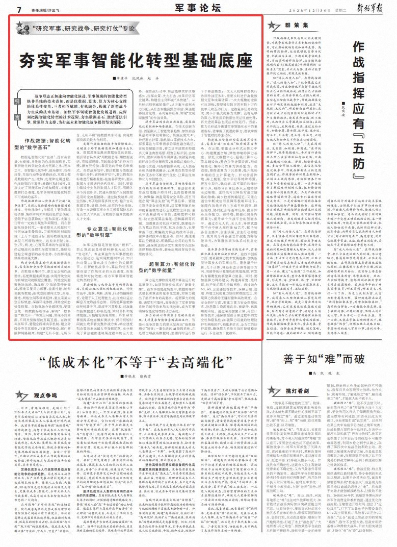 战争形态正加速向智能化演进,军事领域的智能化转型绝非单纯的技术叠加,而是以数据、算法、算力为核心支撑的体系性变革,三者相互赋能、有机融合,构成了新型战斗力生成的技术基础。加快军事领域智能化发展进程,应深刻把握智能化转型的技术逻辑,夯实数据基石、激活算法引擎、做强算力支撑,为打赢未来智能化战争提供坚实保障。