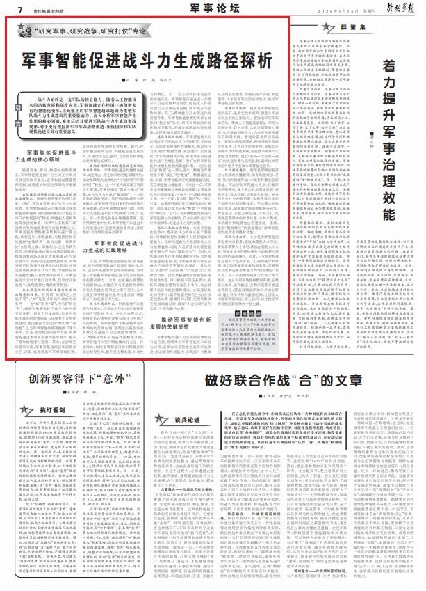 军事智能对战斗力生成的倍增效应日益凸显,持续深化军事智能技术研发与应用,是顺应未来智能化战争形态演进、锻造新型作战能力、实现战斗力整体跃升的必然要求,需要在技术突破、制度建设、人才培育等方面协同发力,推动军事智能创新发展。