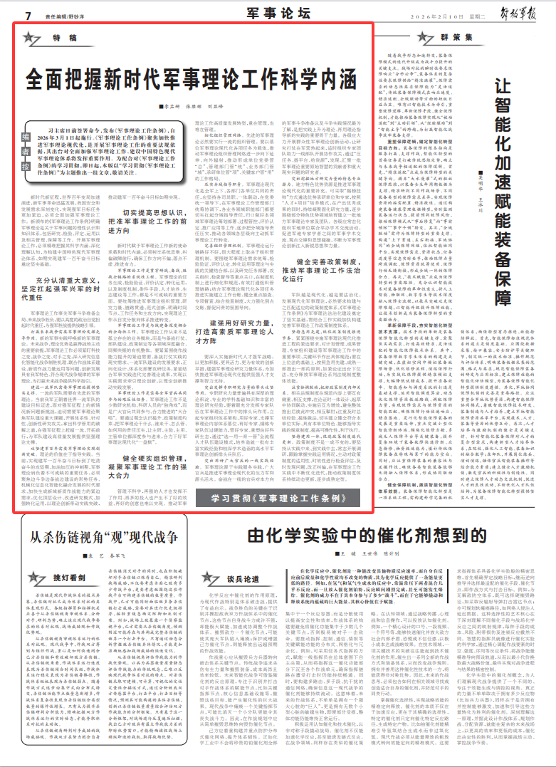 习主席日前签署命令,发布《军事理论工作条例》,自2026年3月1日起施行。《军事理论工作条例》聚焦加快推进军事理论现代化,是开展军事理论工作的重要法规依据,其出台对全面加强军事理论工作、建设中国特色现代军事理论体系将发挥重要作用。为配合对《军事理论工作条例》的学习贯彻,即日起,本版以“学习贯彻《军事理论工作条例》”为主题推出一组文章,敬请关注。