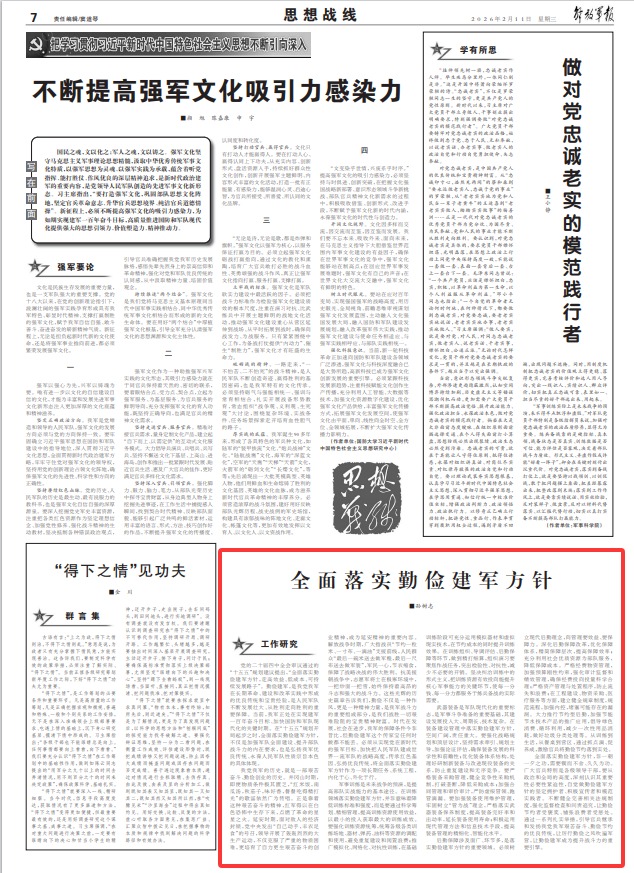 我党我军的历史,就是一部艰苦奋斗、勤俭创业的历史。井冈山时期,即便物质条件极其匮乏,“红米饭,南瓜汤,秋茄子,味好香,餐餐吃得精打光”的歌谣依然广为传唱。正是靠着这种艰苦奋斗的精神,红军得以在白色恐怖中生存下来,点燃了革命的星星之火。延安时期,面对敌人的经济封锁,党中央发出“自己动手,丰衣足食”的号召,领导开展了轰轰烈烈的大生产运动,不仅克服了严重的物质困难,更培育了自力更生艰苦奋斗的创业精神,成为延安精神的重要内容。解放战争时期,广大指战员“节约一粒米、一寸布、一滴油”支援前线,人民群众“最后一碗米送去做军粮,最后一尺布送去做军装”,军民一心,节衣缩食,保障了战略决战的伟大胜利。抗美援朝战争中,志愿军将士在极寒环境中,一把炒面一把雪,始终保持着高昂的斗志和强大的战斗力。这些光辉的历史篇章告诉我们,勤俭不仅是一种作风,更是一种精神力量,是我军战斗力的重要组成部分,是我们战胜一切艰难险阻的宝贵精神财富。时代在发展,社会在进步,我军的保障条件今非昔比,但勤俭建军这个传家宝任何时候都不能丢。必须从实现党在新时代的强军目标、加快把人民军队建成世界一流军队的战略高度,传承红色基因、弘扬优良传统,将全面落实勤俭建军方针作为一项长期任务、系统工程,内化于心、外化于行。