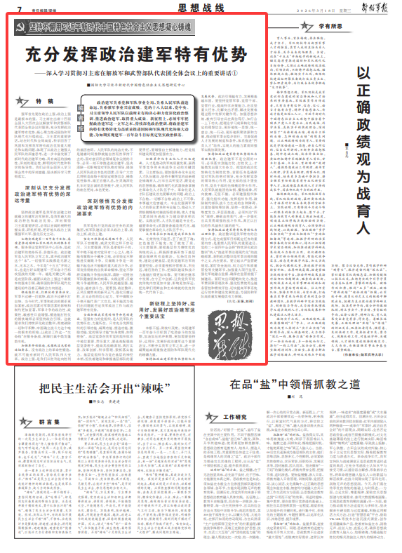 强军首先要在政治上强,政治上强是最根本的强。习主席在出席十四届全国人大四次会议解放军和武警部队代表团全体会议时强调,充分发挥政治建军特有优势,凝心聚力推动国防和军队现代化行稳致远。习主席的重要讲话,站在时代和全局高度,科学回答了巩固和发挥我军特有政治优势重大理论和实践问题,体现了从政治上建强人民军队的深邃思考,进一步丰富发展了新时代政治建军方略,具有高远的战略性、深刻的理论性、鲜明的时代性和科学的指导性。我们必须全面深入学习领会其中的深刻意蕴,坚决抓好学习贯彻落实。