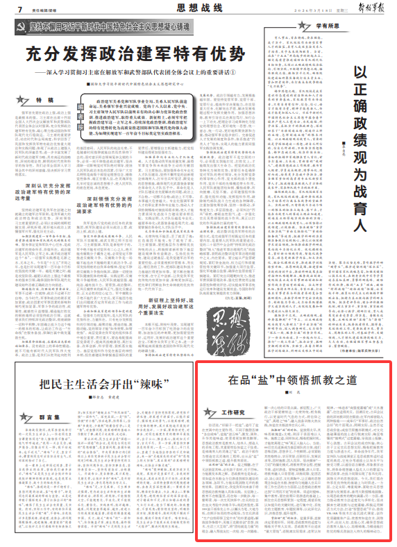 运用好“溶”的方法。盐之精髓,在于无法独显其味,必先溶于食材、化于百味,方能激发本真之鲜。思政教育也是如此,须如盐在水般全方位渗透到部队建设的各领域、各环节,方能实现润物无声的教育效果。回溯历史,我党我军向来善于将思想政治教育融入具体实践。长征路上,教育不在帐篷里,而在每一步跋涉、每一餐野菜、每一次生死抉择中,官兵的信念在血火考验中淬炼升华;南泥湾垦荒,第359旅干部身先士卒,以镢头为笔、大地为纸,在挥汗如雨的劳动现场,为官兵讲清“生产自给即保卫党中央”的朴素道理;解放战争烽烟中,英雄王克勤首创“思想、技术、生活三大互助”,将“团结就是力量”的理念,融入帮战友扛一次枪、校一次瞄准、解一次心结的日常点滴。新征程上,广大政治干部要赓续这一光荣传统,躬身践行,以更富时代气息的方式,将信仰之“盐”、真理之“味”,融入战备训练火热实践,如盐在水般滋养官兵心田。