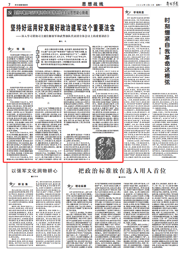 习主席在出席十四届全国人大四次会议解放军和武警部队代表团全体会议时强调,“必须坚持好、运用好、发展好政治建军这个重要法宝,毫不动摇坚持和加强党对军队绝对领导,充分发挥政治建军特有优势,凝心聚力推动国防和军队现代化行稳致远”。这一重要论述,深刻揭示了政治建军对如期实现建军一百年奋斗目标、高质量推进国防和军队现代化的极端重要性,为我们更好地坚持、运用和发展政治建军提供了根本遵循。