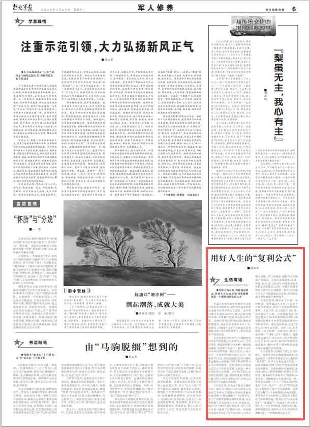 人生的复利,关键在于持之以恒的耐心。复利并非在初期就显现成果,而是会经历一段看似平缓甚至令人绝望的“潜伏期”。许多人正是在这个阶段,一味渴望速成,因看不到立竿见影的效果而选择放弃。而那些最终打破瓶颈、走向成功的人,都深深懂得“长期主义”的价值。“最美新时代革命军人”周勇坤,30多年如一日默默奋斗在备战打仗一线,带领官兵战胜一个又一个困难,最终探索出“七步三结合”“一步六问”等训法战法,有效缩短了战斗力生成周期。他用行动诠释了一个朴素真理:所有的煎熬、等待和不为人知的努力,都是在为最后的飞跃积蓄势能。“复利公式”从未许诺我们“一夜暴富”“一夜成名”,但它给了每个人一个公平的承诺:只要方向正确,保持精进状态,坚持久久为功,时间终将馈赠我们一个指数级增长的人生。
