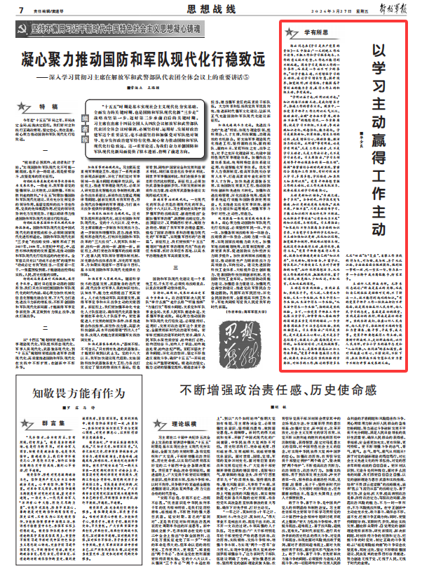 “学所以益才也,砺所以致刃也。”知识的海洋浩瀚无边,是我们增长才干、推进工作的营养宝库。现实中,一些党员干部干工作之所以死气沉沉、被动应付,出现“老办法不管用、新办法不会用”的尴尬情况,一个重要原因,就是学习不积极、不主动,导致出现知识老化、观念僵化、能力退化。学习是获取新知、积累经验、增长本领的过程,也是增强信心、调动潜能、激活潜力的过程。正所谓“事有所成,必是学有所成”,凡是工作主动者、无不是学习主动者,凡是工作出彩者、无不是学习出色者。习主席指出,“学习本领是领导干部必须具备的第一位本领”,强调“要紧密结合新时代新实践,紧密结合思想和工作实际,有针对性地重点学习,多思多想、学深悟透,知其然又知其所以然”。党员干部要想掌握工作的主动权、让工作充满生机活力,就要永葆主动学习的进取心。