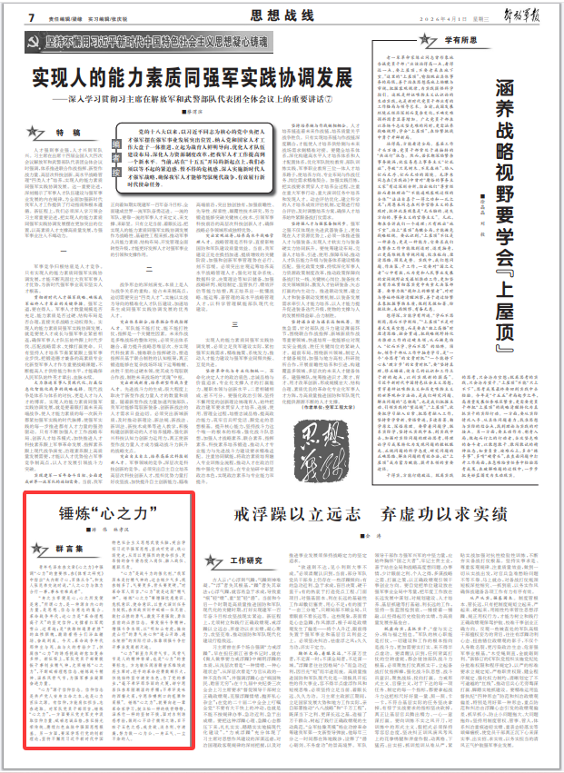 “心力”源于信仰信念。信仰信念是共产党人安身立命之本,也是心力茁壮之源。有信仰,方能肩扛担当,志在进取。对军队党员干部而言,锤炼“心之力”,一方面要从党史军史中汲取信仰力量、砥砺忠诚品格,在弘扬光荣传统、赓续红色血脉中强固思想根基。另一方面,要深学笃行党的创新理论,坚持不懈用习近平新时代中国特色社会主义思想武装头脑,突出学好习近平强军思想,坚决听党话、铁心跟党走,从而以更强烈的使命担当、更昂扬的奋斗姿态投入岗位、融入战位、履职尽责。