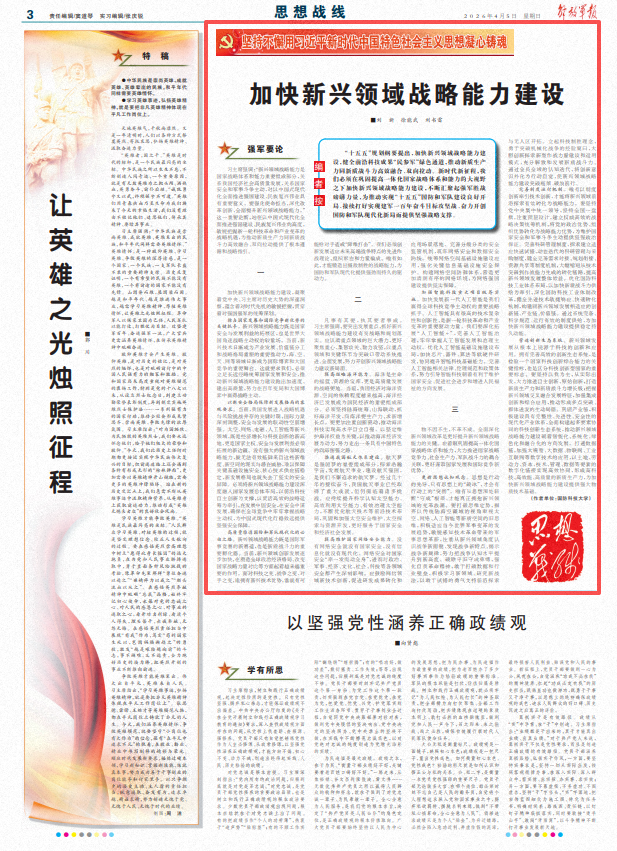 加快新兴领域战略能力建设,凝聚着党中央、习主席对历史大势的深邃洞察,蕴含着对时代先机的敏锐把握,贯穿着对强国强军的统筹谋划。