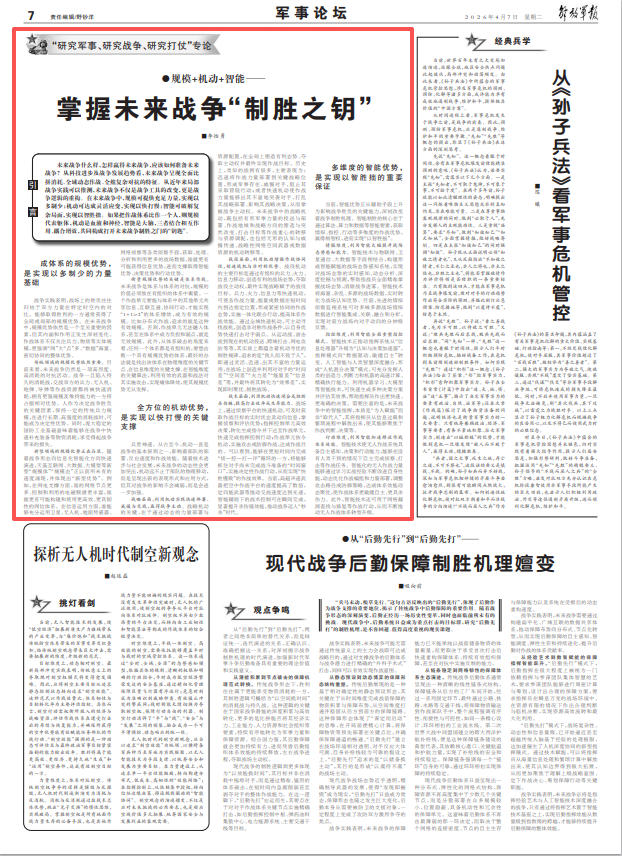 未来战争什么样,怎样赢得未来战争,应该如何准备未来战争?从科技进步及战争发展趋势看,未来战争呈现全面比拼消耗、全域动态作战、全维复杂对抗的特征。从近年来局部战争实践可以推测,未来战争不仅是战争工具的改变,更是战争逻辑的重构。在未来战争中,规模可提供充足力量,实现以多制少;机动可达成灵活应变,实现以快打慢;智能可破解复杂局面,实现以智胜拙。如果把作战体系比作一个人,则规模代表躯体,机动是血液和神经,智能是大脑,三者结合相互作用、耦合增效,共同构成打开未来战争制胜之门的“钥匙”。