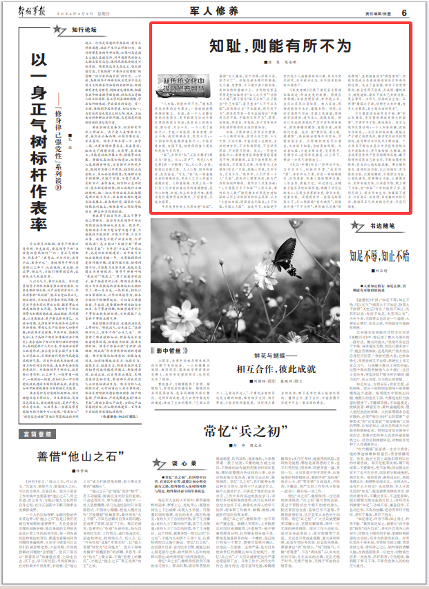 知耻,于修身律己而言至关重要。一个人唯有知耻,面对不当之利、不义之举、不法之事,才能自觉心生愧疚、主动约束言行,不为私欲所惑、不为浮华所动、不为陋习所染。反之,一旦丧失羞耻之心,在诱惑考验面前便很容易善恶不辨、荣辱颠倒,以至于放弃原则、突破底线,乃至肆无忌惮、任性妄为。《谷梁传》有言:“无耻,则随心所欲,无所不为,无恶不作。”现实中,人们斥责一个人“无耻”,就是内心极度厌恶、极为严厉的批判和鄙视。故而古人反复告诫:“人之患莫大乎不知耻”“人而无耻,果何以为人哉?”清代龚自珍更是把对知耻的认识上升到国家和社会层面,认为“士皆知有耻,则国家永无耻矣;士不知耻,为国之大耻”。由此可见,知耻绝不仅仅是个人道德修养的小事,更关乎党风政风,关乎政治生态,关乎国家民族的兴衰存亡。