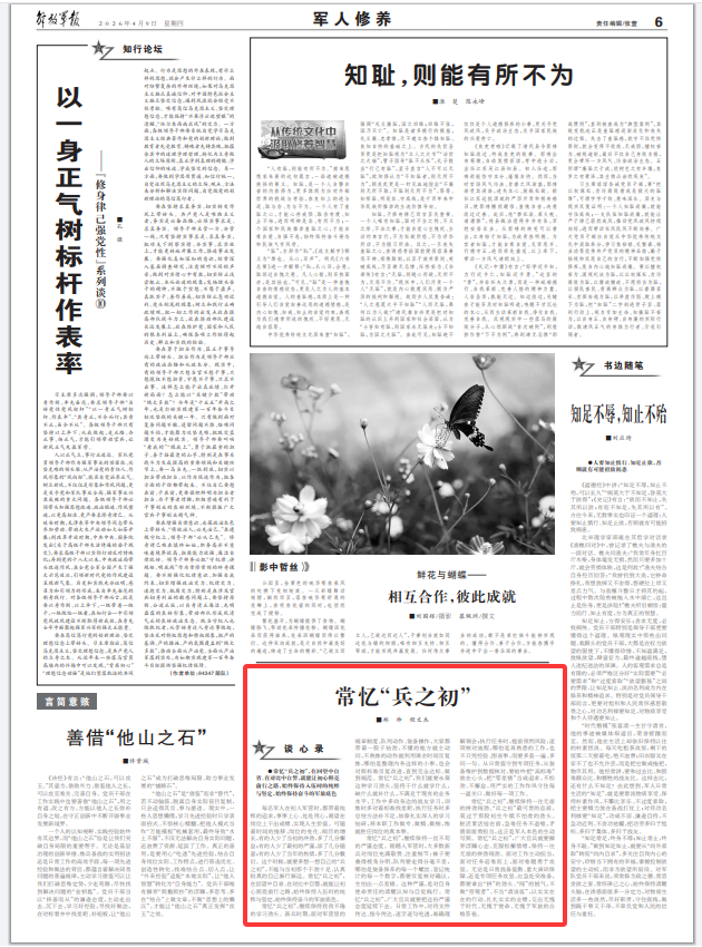 每名军人在初入军营时,都带着纯粹的追求,事事上心、处处用心,渴望在岗位上干出成绩、实现人生价值。可随着时间的推移、岗位的变化、阅历的增长,有的人少了当初的冲劲,多了几分懈怠;有的人少了最初的严谨,添了几分随意;有的人少了当年的热情,多了几分敷衍。这个时候,就要多想一想自己的“兵之初”,不能与当初那个干劲十足、认真较真的自己渐行渐远。常忆“兵之初”,在回望中自省、在对比中自警,就能让初心照亮前行之路,始终保持入伍时的纯粹与坚定,始终保持奋斗的军旅底色。