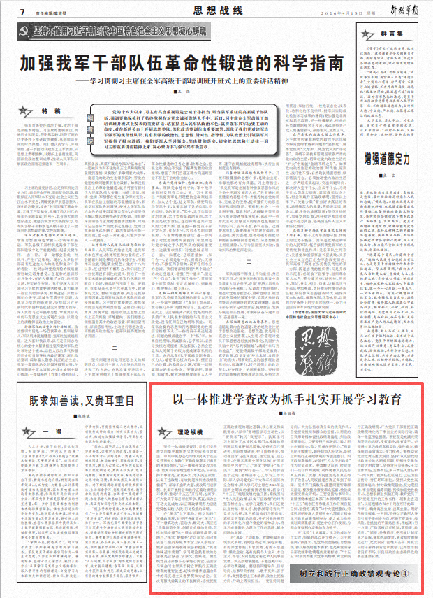 坚持一体推进学查改,是我们党开展党内集中教育的宝贵经验和有效做法。中共中央办公厅印发的《关于在全党开展树立和践行正确政绩观学习教育的通知》指出,“以一体推进学查改为抓手,教育引导各级党组织和党员、干部坚持实事求是、求真务实,为人民出政绩、以实干出政绩,有效防范和纠治政绩观偏差”。深学不怠明大道,实改笃行启新程。扎实开展树立和践行正确政绩观学习教育,推动“十五五”开好局、起好步,广大党员干部必须在深学、真查、实改上下功夫见成效,以正确政绩观努力创造经得起实践、人民、历史检验的实绩。