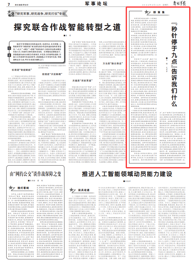 “秒针停于9点”这一看似微小的物理现象,与现代作战有异曲同工之妙:没有深刻的关系认知,能量调控便失去精准方向;没有持续的能量调控,临界决胜便缺乏必要蓄势;没有对“临界点”的精准把握,前期的所有努力可能功亏一篑。这也深刻启示我们,现代作战的关键在于洞察结构、调控能量、把握临界,在看似混沌的战场中,及时发现并精准把握那个决定胜利的“9点位置”,毫不犹豫地给予对手致命一击。
