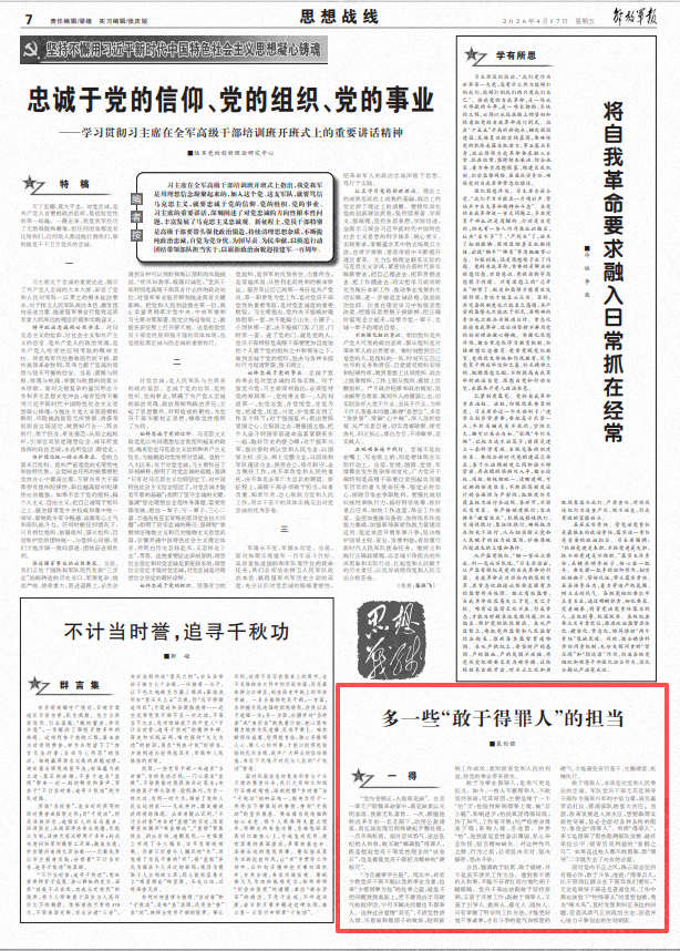 敢于得罪人,本质是对党和人民事业的忠诚。军队党员干部尤其是领导干部作为强军兴军的中坚力量,肩负着带兵打仗、管理部队的重大责任。当前,改革发展进入深水区,想要取得实质性突破,势必会面对各种各样的阻力,难免会“得罪人”。所谓“得罪人”,多半是得罪了那些阻碍部队发展、破坏单位公平、侵害官兵利益的“害群之马”。如果连这些人都不敢得罪,那“领导”二字就失去了应有的分量。