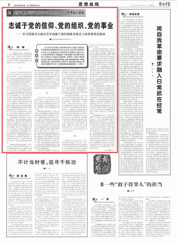 编者按 习主席在全军高级干部培训班开班式上指出,我党我军是用理想信念凝聚起来的,加入这个党、这支军队,就要笃信马克思主义,就要忠诚于党的信仰、党的组织、党的事业。习主席的重要讲话,深刻阐述了对党忠诚的方向性根本性问题,丰富发展了马克思主义忠诚观。新征程上,党员干部特别是高级干部要带头强化政治锻造,持续清理思想杂质,不断提纯政治忠诚,自觉为党分忧、为国尽责、为民奉献,以模范行动团结带领部队担当实干,以崭新政治面貌迎接建军一百周年。