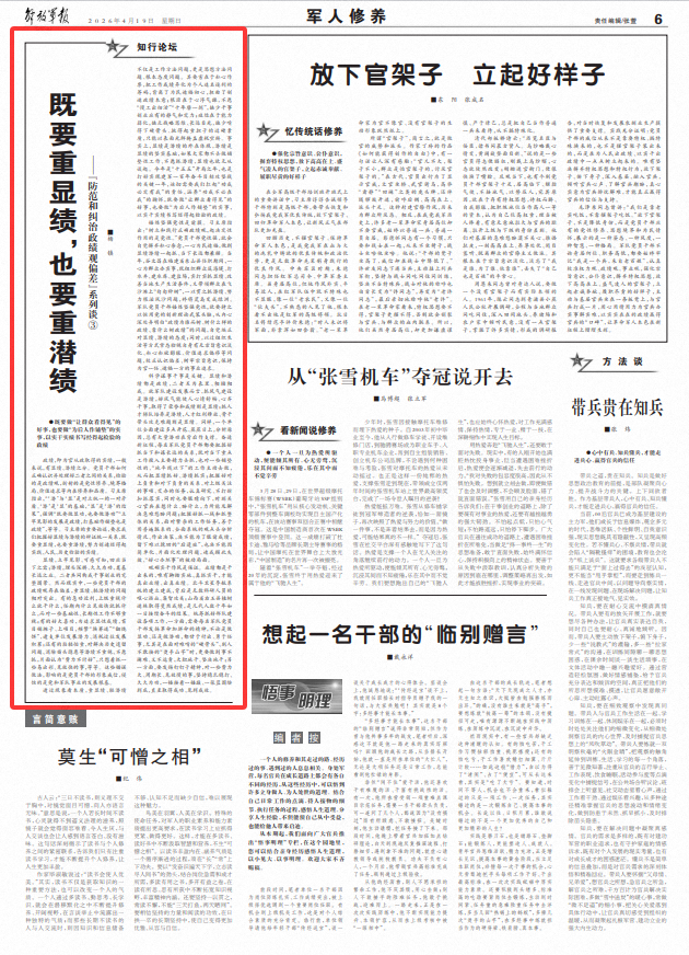 显绩,立竿见影、可感可知,回应当下之需;潜绩,埋头深耕、久久为功,奠基长远之业。二者共同构成干事创业的完整图景。然而现实中,一些党员干部的政绩观存在偏差,重显绩、轻潜绩的问题相对突出。有的急功近利,上级重视什么就干什么,任期内什么见效快就抓什么,而对一些基础性、长期性工作不够重视;有的好大喜功,为追求显性成绩,盲目铺摊子、上项目,频繁“换赛道”“翻烧饼”,透支单位发展潜力、消耗过往发展积累;还有的拈轻怕重,对解决历史遗留问题、消除苗头隐患等潜绩不重视、不愿抓,片面认为“费力不讨好”,只想着抓一些易出彩、见效快的事,等等。这些错误做法,影响的是党员干部的形象威信,侵蚀的是党和军队事业的发展根基。