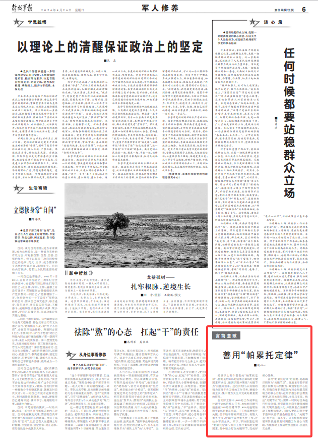 经济学上有个著名的“帕累托定律”,指的是约80%的结果由20%的关键因素所决定,强调识别并聚焦“关键节点”以提升效率。这启示我们,以有限的精力面对千头万绪的工作任务,要能分清主次,集中精力关注并完成好最重要的任务。