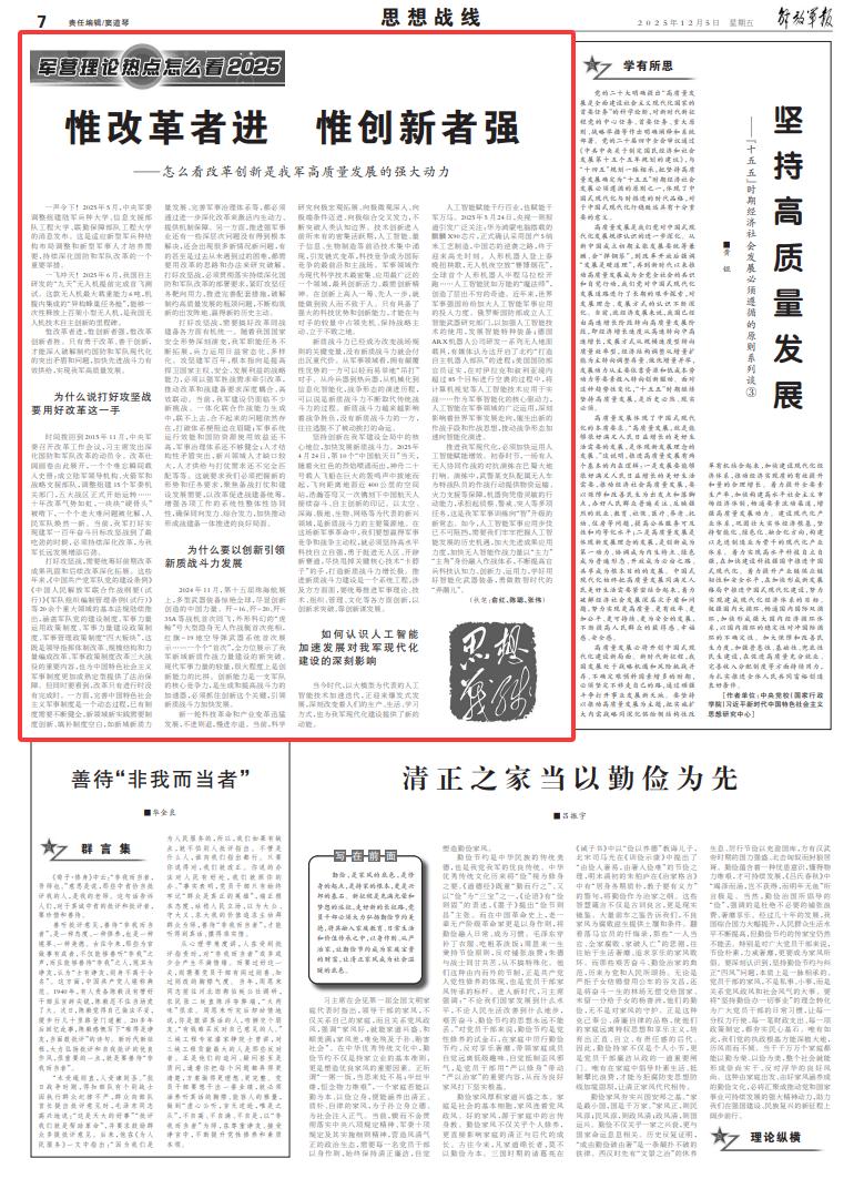 坚持创新在我军建设全局中的核心地位,加快发展新质战斗力。2025年4月24日,第10个“中国航天日”当天,随着火红色的烈焰喷涌而出,神舟二十号载人飞船在巨大的轰鸣声中拔地而起,飞向距离地面近400公里的空间站,浩瀚苍穹又一次镌刻下中国航天人接续奋斗、自主创新的印记。以太空、深海、极地、生物、网络等为代表的新兴领域,是新质战斗力的主要策源地。在这场新军事革命中,我们要想赢得军事竞争和战争主动权,就必须坚持高水平科技自立自强,勇于挺进无人区、开辟新赛道,尽快甩掉关键核心技术“卡脖子”的手,打造新质战斗力增长极。推进新质战斗力建设是一个系统工程,涉及方方面面,要统筹推进军事理论、技术、组织、管理、文化等各方面创新,以创新求突破、靠创新谋发展。