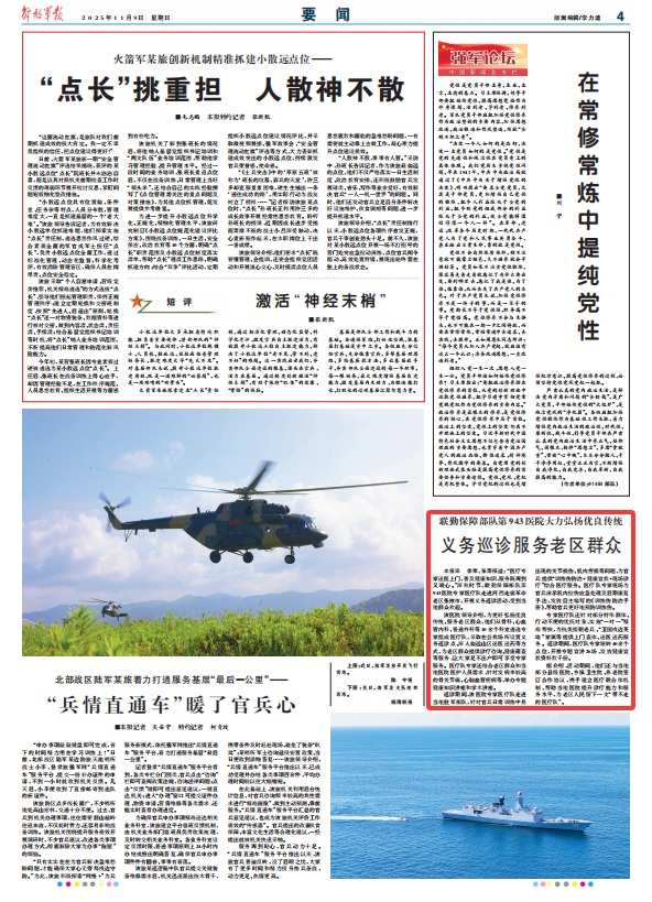 解放军报讯 李荣、张萍报道:“医疗专家送医上门,普及健康知识,服务既周到又暖心。”深秋时节,联勤保障部队第943医院专家医疗队走进河西走廊革命老区张掖市,开展义务巡诊活动,受到当地群众欢迎。
