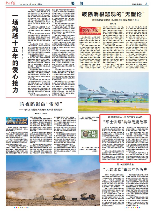 解放军报讯 赵云翔报道:“面对步步逼近的敌军,5位战士无所畏惧、舍身跳崖……”近日,联勤保障部队工程大学某学员大队“军士讲坛”如期开讲,学员湛宇亨登上讲台,分享本单位“狼牙山五壮士”战旗背后的感人故事。