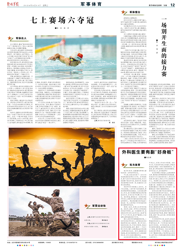 作为神经外科主任,这些年,我也经常鼓励年轻医生,一定要坚持体能训练和体育运动,有一个好身体才能够更好地为官兵服务。如今在医院里,官兵都很注重体能锻炼,越来越多的战友热爱上了游泳、骑行等运动。我从20多年的运动经历中得到一个切身体会:只有自己有了健康的体魄,才能更好地为兵服务,在手术台上稳稳地握住那把治病救人的手术刀。