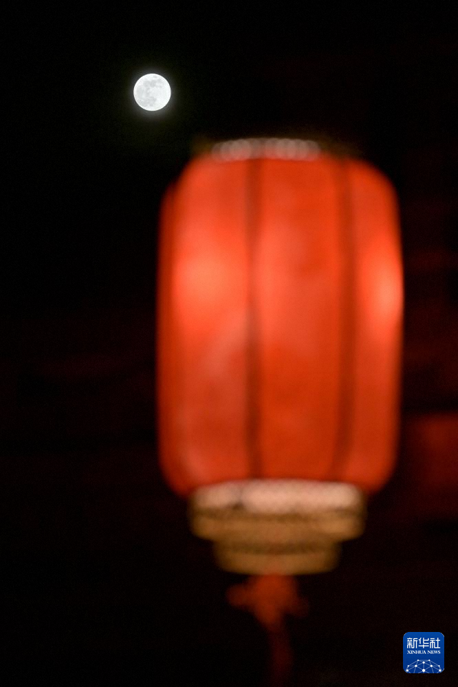 1月3日在北京拍摄的月亮和传统灯饰。
