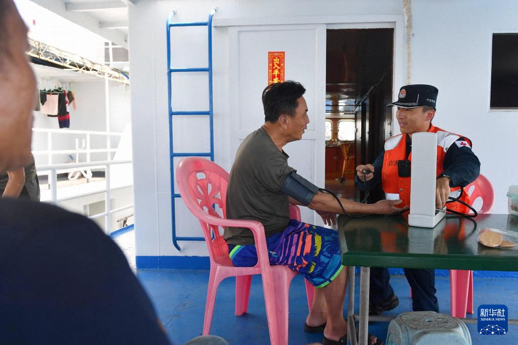 3月4日,海警三都舰执法员为附近海域渔民提供医疗服务。