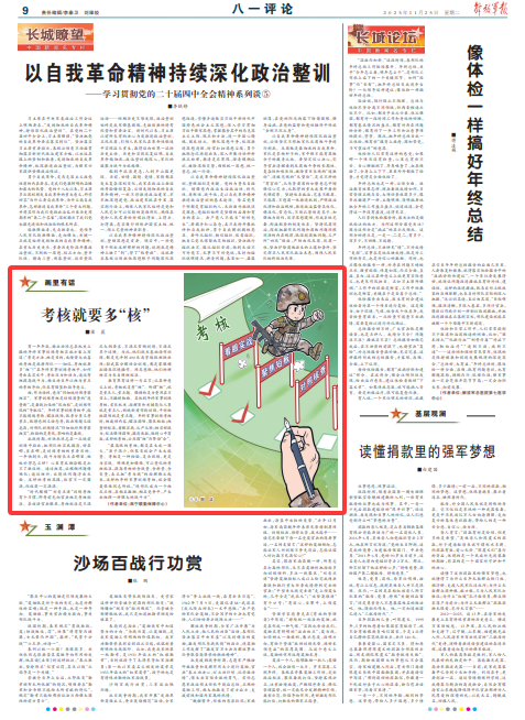 教育界有这样一句名言:从某种意义上说,考核就是考“核”。所谓“核”,就是重点人、重点题。强调的是力量用在刀刃上,不撒胡椒面。具体到年终军事训练考核,首长机关、指挥员和关键岗位人员就是重点人,新域新质作战训练、平时短板弱项就是重点题。年终军事训练考核时,核减好内容,瞄准弱项、聚焦短板;核查好标准,着眼实战、从严从难;核实好战力,校准强项弱项,摸清底数,做到心中有数,这样的考核,必然因“核”而带动“合”。