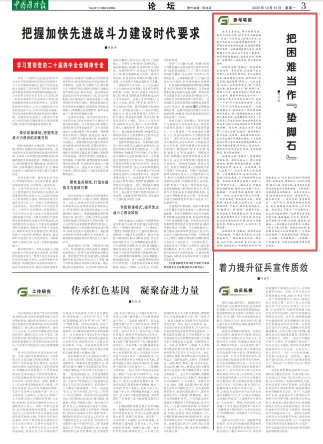 把困难当作“垫脚石”,需要练就过硬本领。困难无论大小,绝不是轻轻松松、敲锣打鼓就能征服的,关键是要有真本事、硬功夫。本领过硬,多“几把刷子”,才能充满自信克服困难。口号喊得震天响,本领不过硬,不仅难以战胜困难,还可能贻误事业发展。焦裕禄正是因为找到了治理“三害”的科学方法——翻淤压沙、种植泡桐等耐碱作物,最终成功治服了风沙、盐碱地。本领是降服困难的“通行证”。但是,过硬本领不会从天而降。广大官兵要想“曾益其所不能”,就要坚持“刀在石上磨,人在事上练”,主动到困难大、矛盾多、情况复杂的地方,啃“硬骨头”、涉“险滩”,在躬身实践、总结经验中寻规律找办法,在开动脑筋、探索创新中长才干强本领,努力成为攻坚克难的时代先锋,做到无论事有多难,都能从容应对、主动作为、不辱使命。