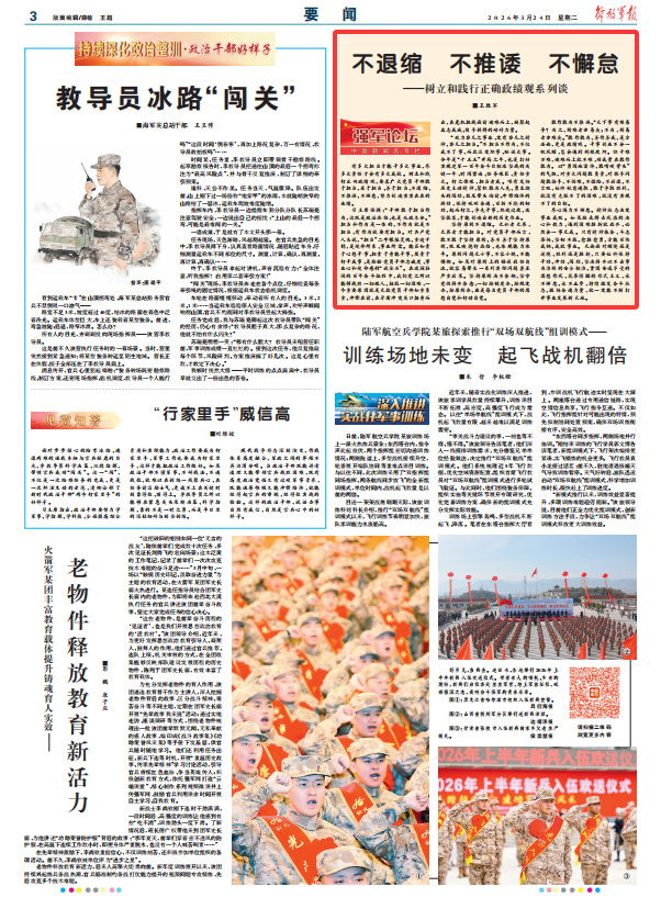 “致力非凡之事业,定有非凡之精神、非凡之担当。”不担当不作为,不仅成不了事,而且注定坏事、贻误大事。今年是“十五五”开局之年,也是打好实现建军一百年奋斗目标攻坚战的关键一年,时间紧迫、任务艰巨、责任重大。行之惟艰,担当者成。唯有发扬历史主动精神,蓄积敢为人先、勇立潮头的闯劲,鼓足带头向前、冲锋陷阵的拼劲,保持砥砺奋进、百折不挠的韧劲,起而行之、争先干事,爬坡过坎、攻坚拔寨,才能创造出新的历史伟业。