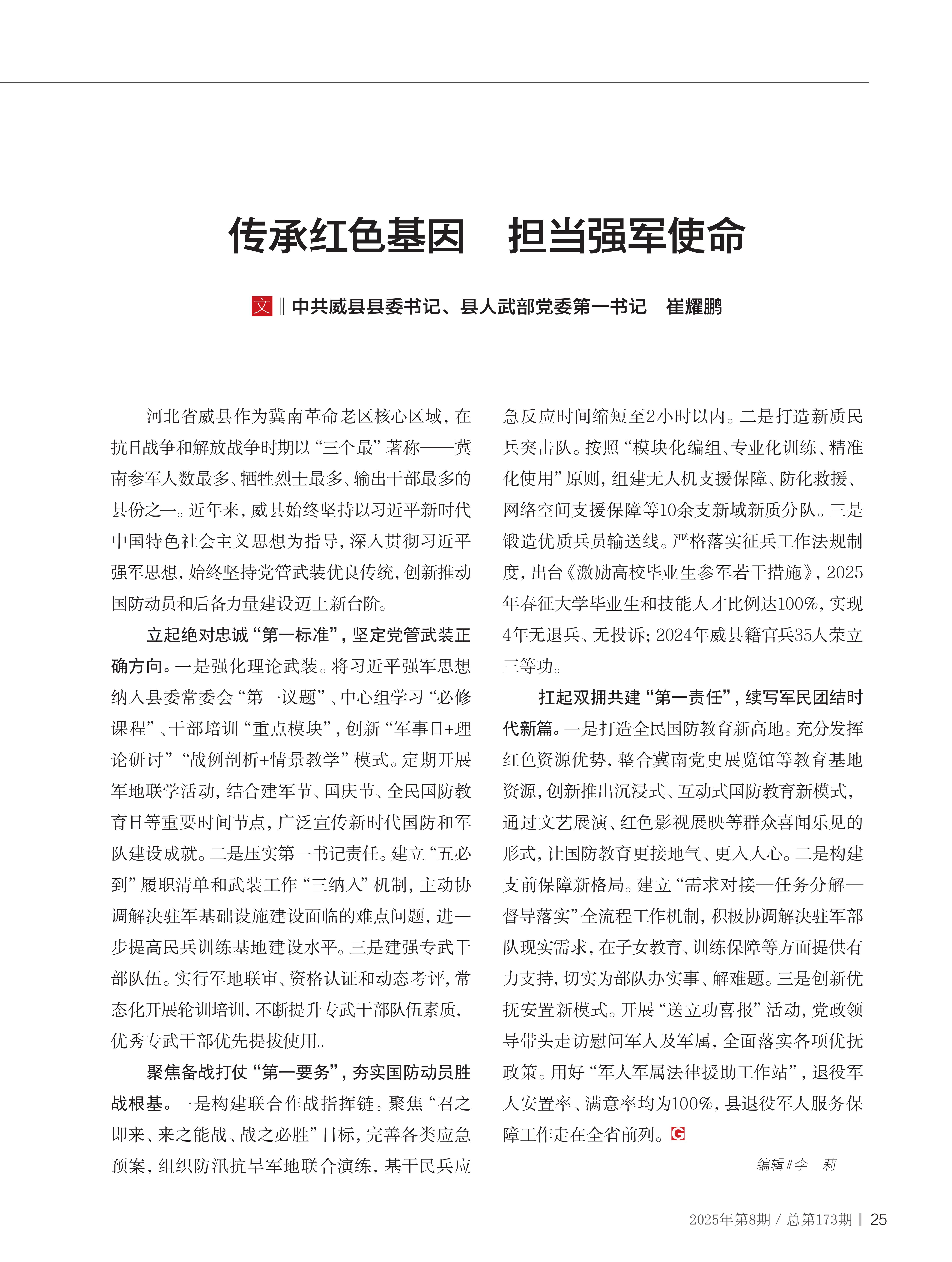 作者:中共威县县委书记 县人武部党委第一书记  崔耀鹏