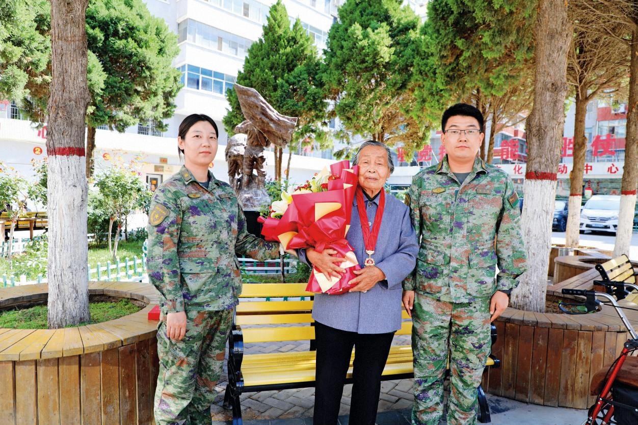 兰州第六离职干部休养所为老干部遗孀毕桂兰颁发“光荣在党50年”纪念章。