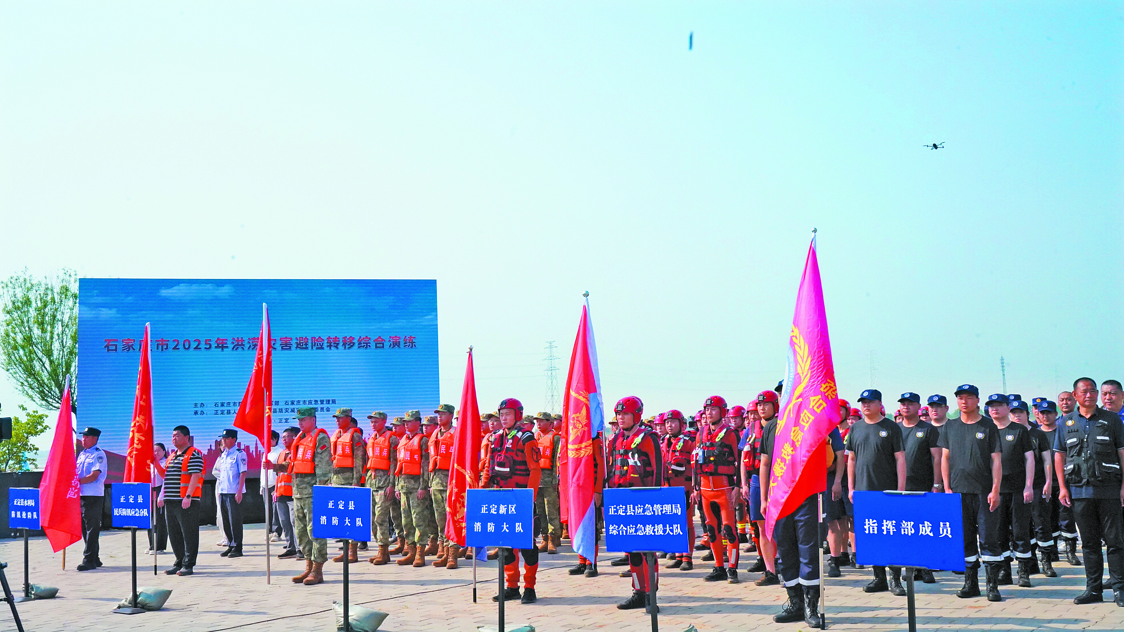 正定县军地组织民兵应急分队与其他应急力量联合开展抗洪抢险综合演练。(摄影/王双豹)