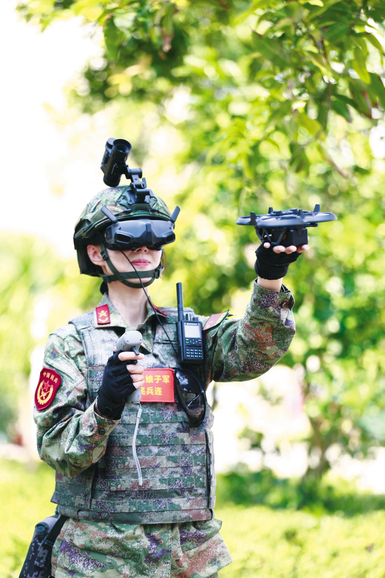 红色娘子军民兵连女民兵操作新型科技装备遂行支援保障任务。