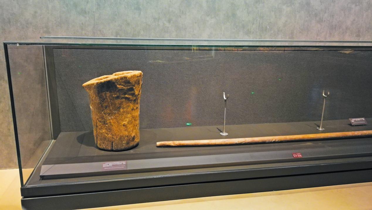 淮海战役期间支前民工加工军粮使用过的木臼和木棒。