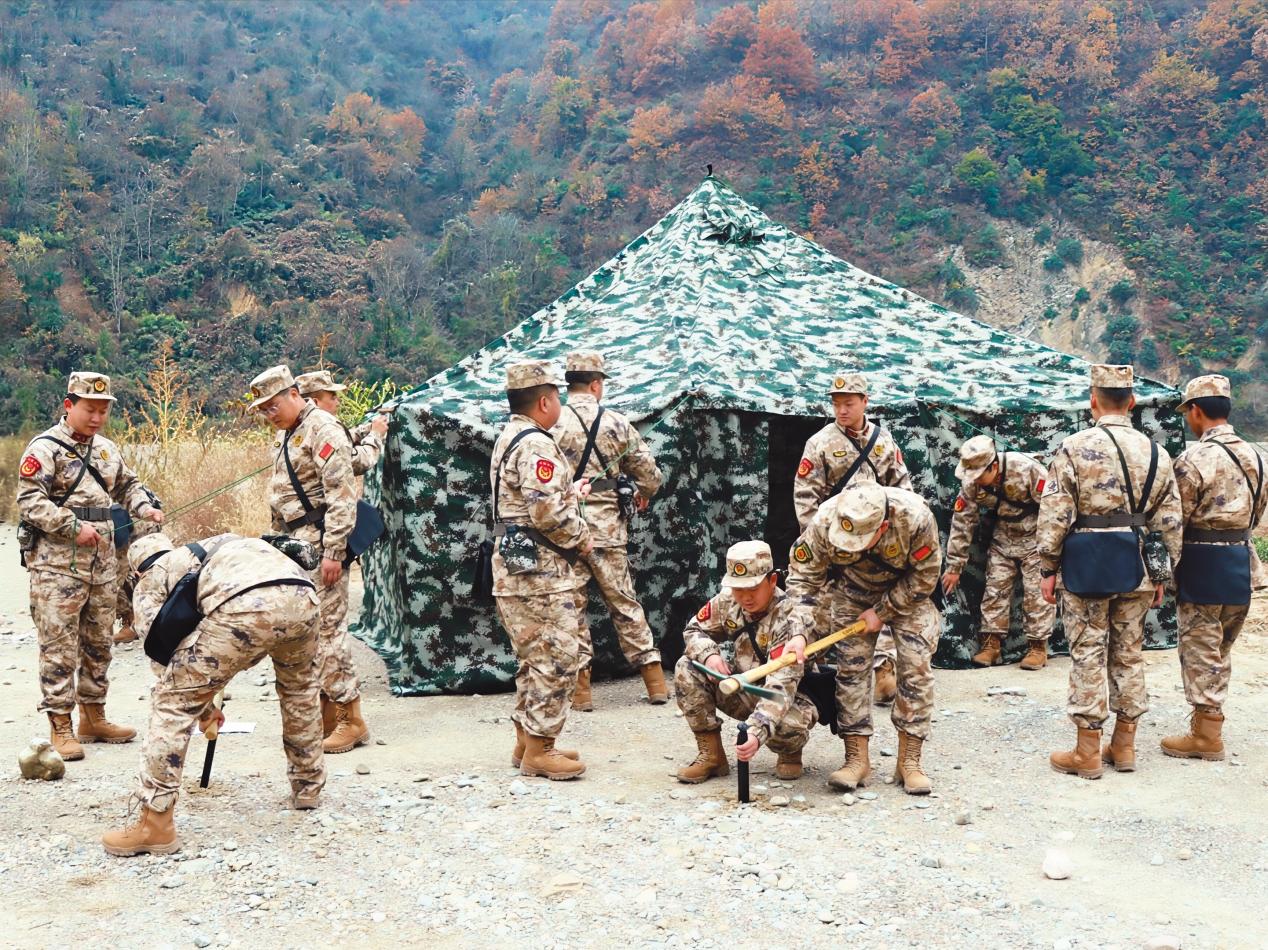 陈红军民兵连组织民兵进行野外帐篷搭设训练。(摄影/毛 刚)