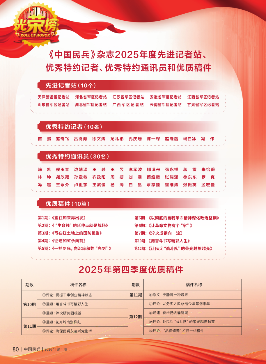 为深入贯彻军委国防动员部新闻舆论工作会议精神,更好体现军媒姓党的鲜明特色、军事指导类中央级期刊的特殊定位、军委国防动员部党委机关刊的基本属性,根据《中国民兵》杂志接刊以来的运行情况和广大官兵及读者反映,我们对本刊2026年栏目设置进行了调整优化,现将调整后的37个栏目予以公布,望大家继续给予关注支持并多提建设性的意见建议。
