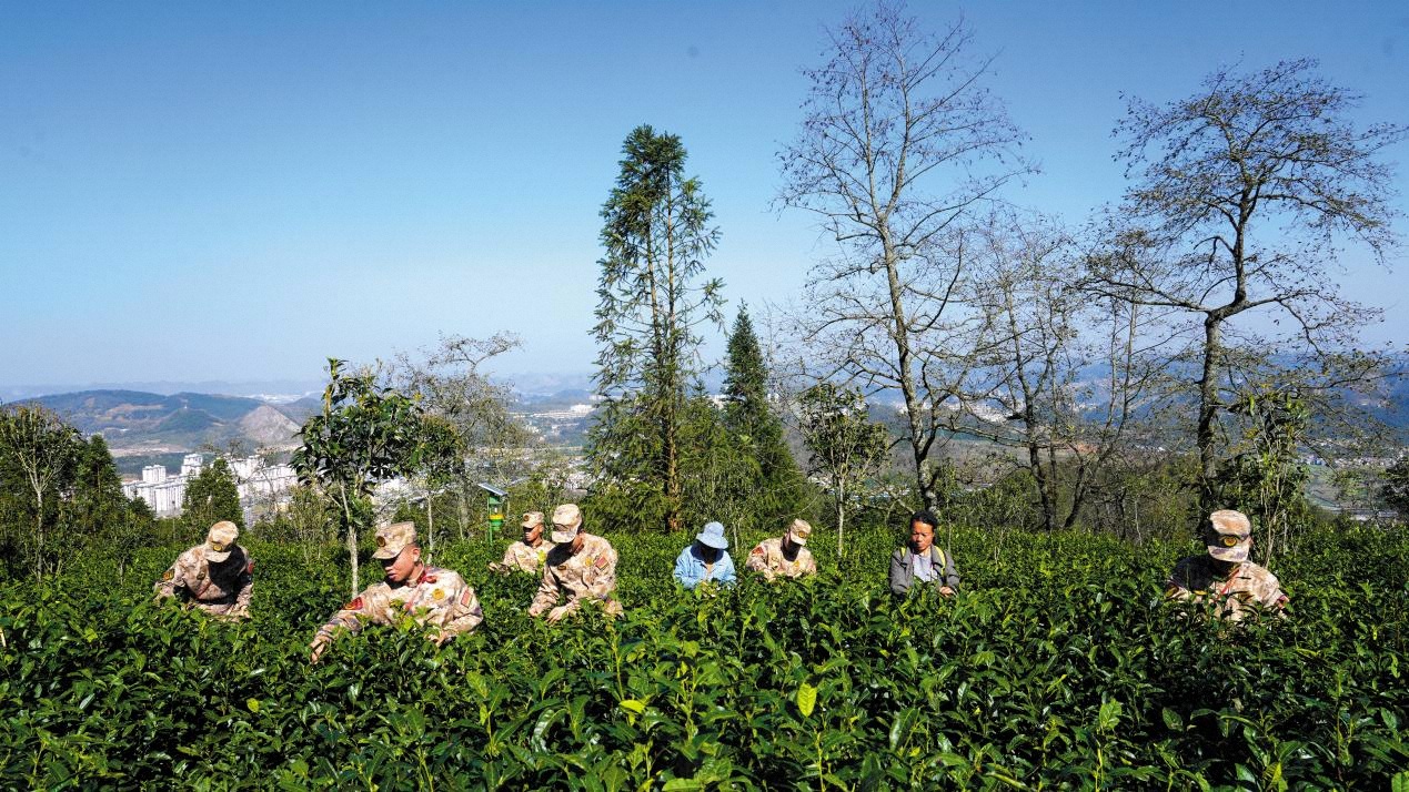 兴义市人武部组织民兵助农分队帮助当地群众采摘茶叶。(摄影/陈雪儿)