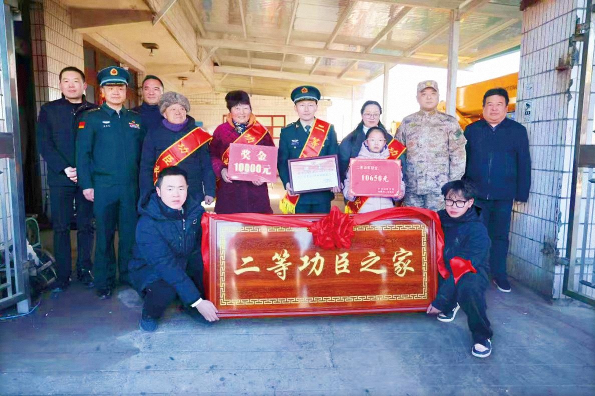 如皋市军地领导为立功军人家庭送喜报并与家属合影。(摄影/郭凤娇)