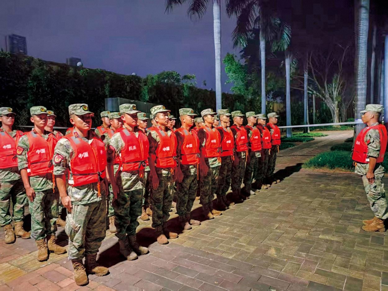 南宁警备区组织民兵应急分队民兵党员连夜奔赴救灾一线展开救援工作。(摄影/方家溪)