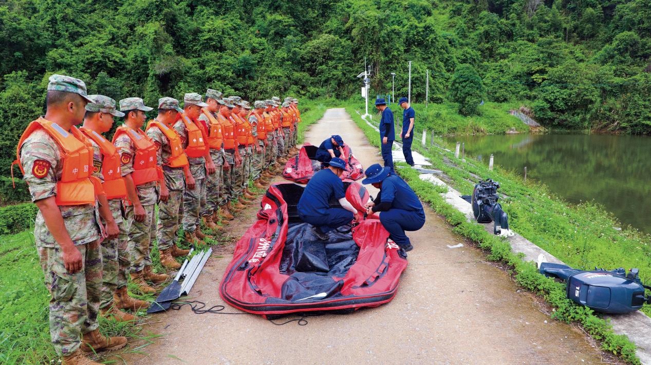 龙州县人武部邀请地方专业技术人员为民兵应急分队进行冲锋舟操作示范教学。(摄影/黄玉超)