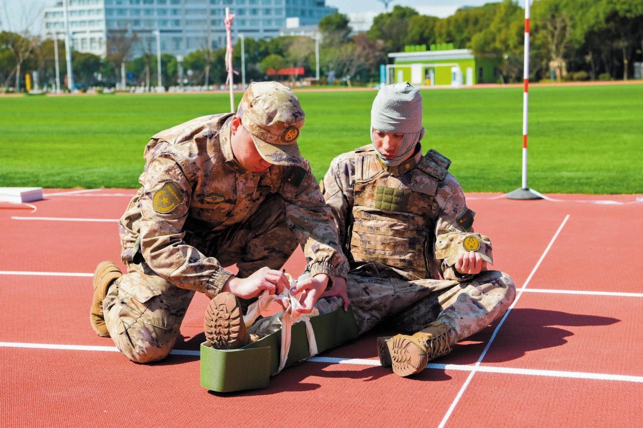 嘉兴离职干部休养所组织文职人员开展战场救护课目训练。